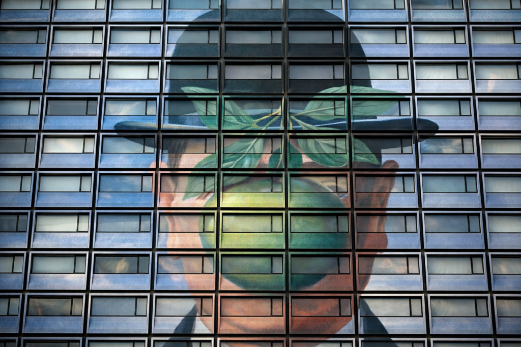 Aujourd’hui, cette même tour existe toujours. Mais elle ne se donne plus à voir de la même manière. Depuis sa transformation en Cardo Brussels Autograph Collection, sa façade s’est métamorphosée. Elle n’est plus une façade au sens strict. Elle est devenue une surface picturale, un espace de projection. Un hommage monumental à René Magritte.